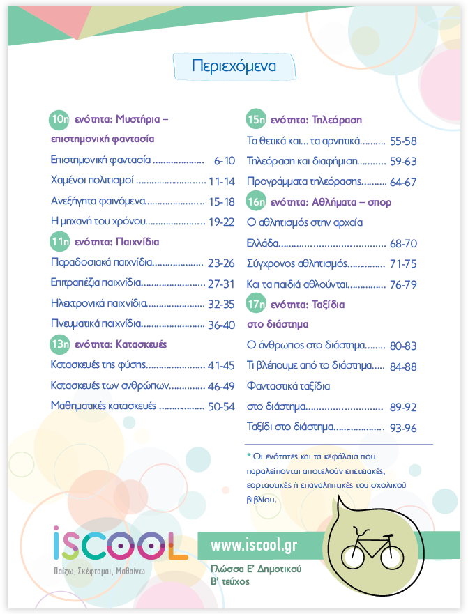 17η ενότητα: Ταξίδια στο διάστημα. Ο άνθρωπος στο διάστημα (ανάλυση σύνθετων ρημάτων στα συνθετικά του, σύμφραση- έκφραση) - Τι βλέπουμε από το διάστημα (ρόλος και λειτουργία του άρθρου, ονοματικές- ρηματικές φράσεις, ενεργητική- παθητική σύνταξη) - Φανταστικά ταξίδια στο διάστημα (ενεργητική- παθητική σύνταξη, μετατροπή ονοματικής φράσης σε ρηματική και το αντίστροφο, συλλαβισμός) - Ταξίδι στο διάστημα ( επίθετα, ονοματικές- ρηματικές φράσεις)
