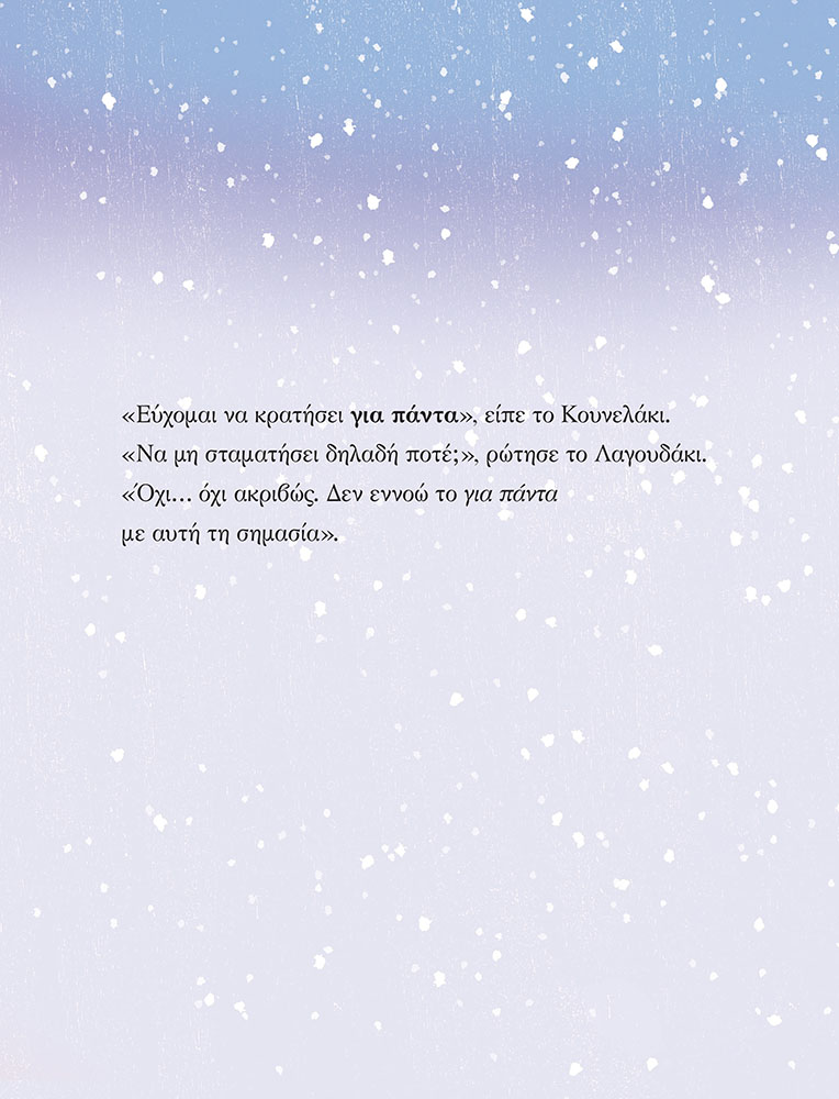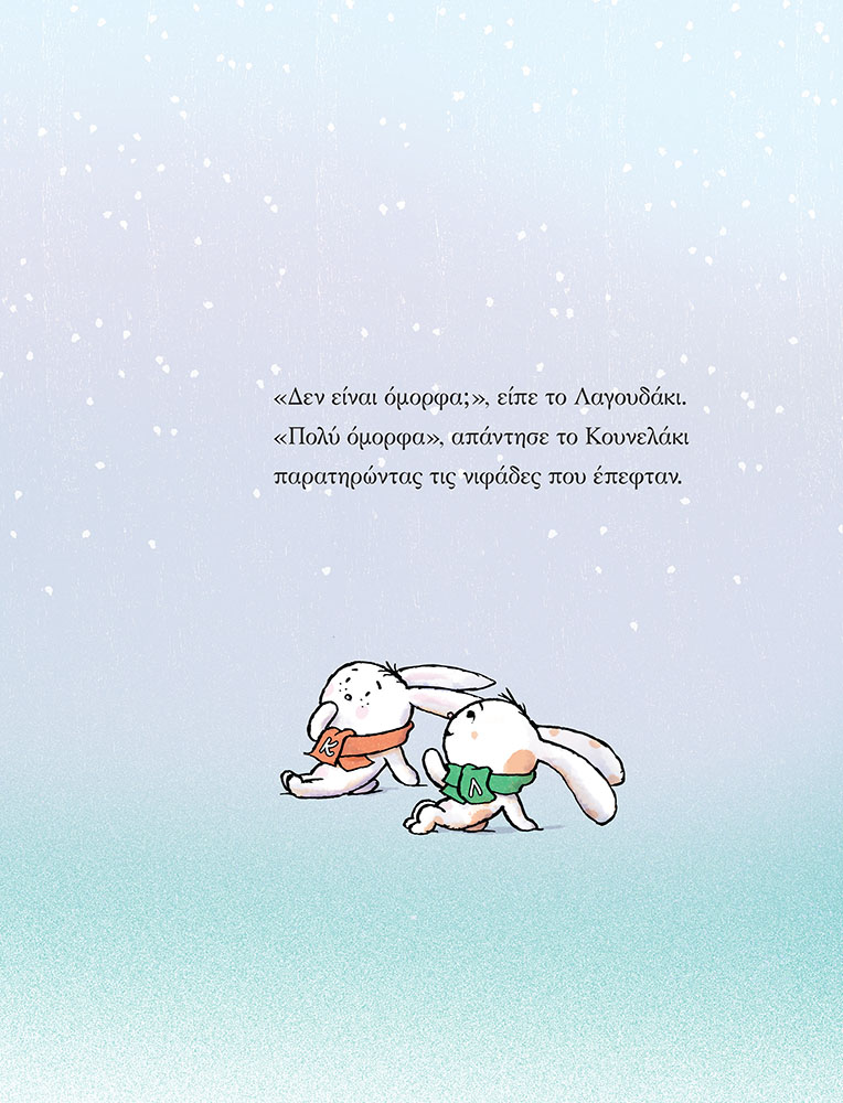 Το κουνελάκι και το Λαγουδάκι είναι οι καλύτεροι φίλοι και χαίρονται γιορτάζοντας μαζί για τα «δώρα» που προσφέρει η φύση όλες τις εποχές όπως: η ευωδιά των λουλουδιών την Άνοιξη, τα χρυσοκίτρινα φύλλα το Φθινόπωρο, η νόστιμη γεύση που έχουν τα αλμυρίκια το Καλοκαίρι, η σιωπηλή ομορφιά του πρώτου χιονιού που πέφτει τον Χειμώνα. Τα μικρά μεγάλα θαύματα του κόσμου είναι μια αισιόδοξη υπενθύμιση ότι αν δώσουμε προσοχή σε όσα συμβαίνουν γύρω μας θα νιώσουμε πως μπορούμε πάντα να βρούμε την ελπίδα μέσα από τις φιλίες μας, στη φύση και στη γενναιοδωρία που δείχνουμε ο ένας προς τον άλλον.