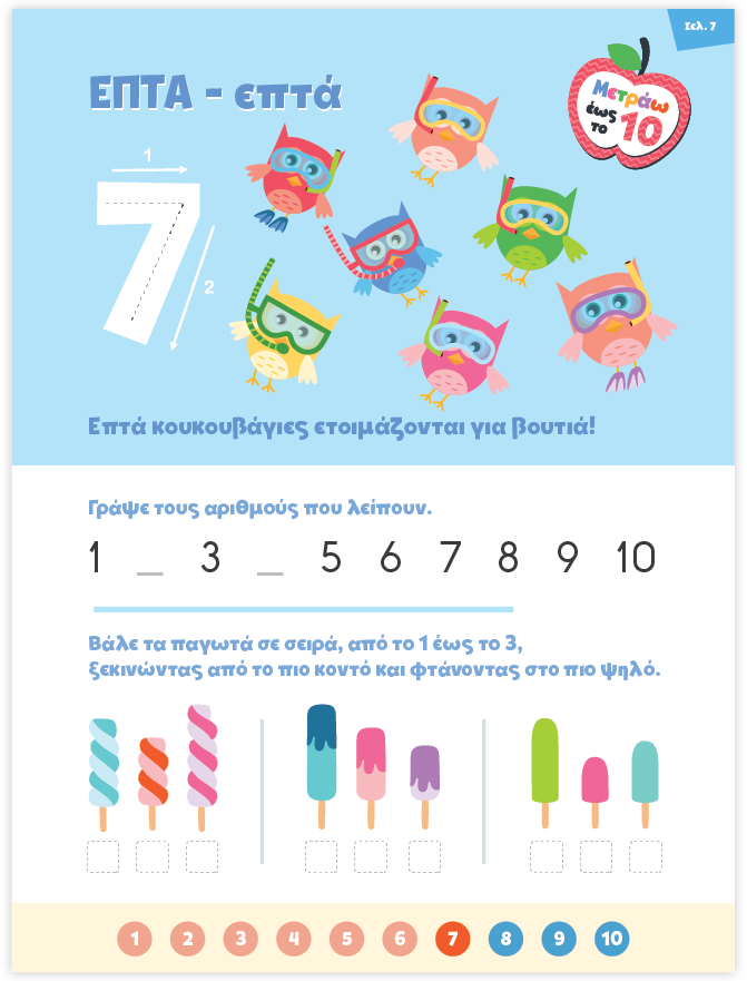 Το βιβλίο αυτό είναι ιδανικό για την εξάσκηση στο Νηπιαγωγείο, την ουσιαστική εκμάθηση των αριθμών από το 6 έως το 10, την καλλιέργεια μαθηματικής σκέψης και την προετοιμασία για την Α’ Δημοτικού. Ακόμη, αποτελεί ένα εξαιρετικό βοήθημα για την ανάπτυξη της δημιουργικότητας και της φαντασίας μέσα από πρωτότυπες δραστηριότητες.