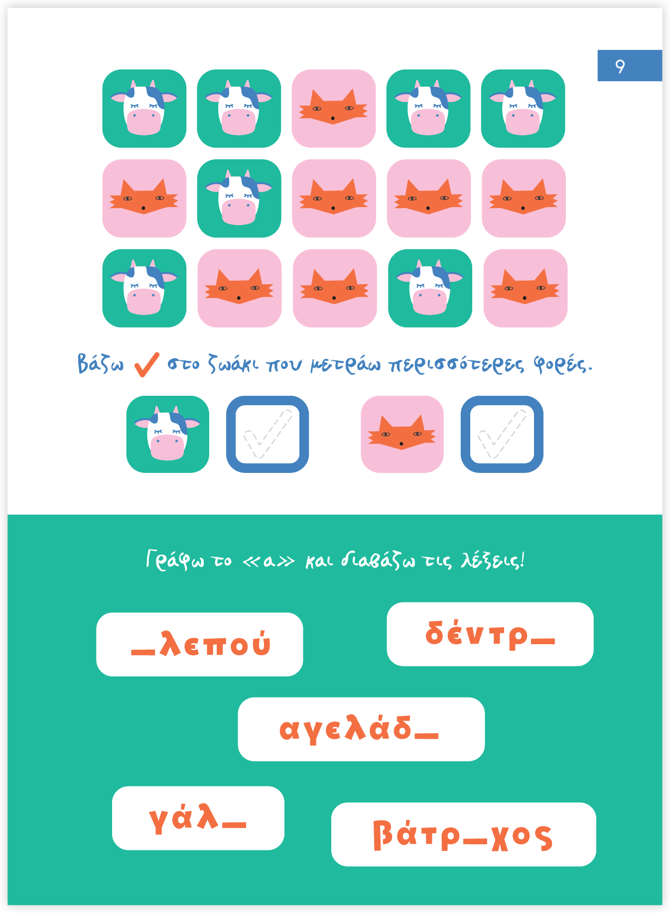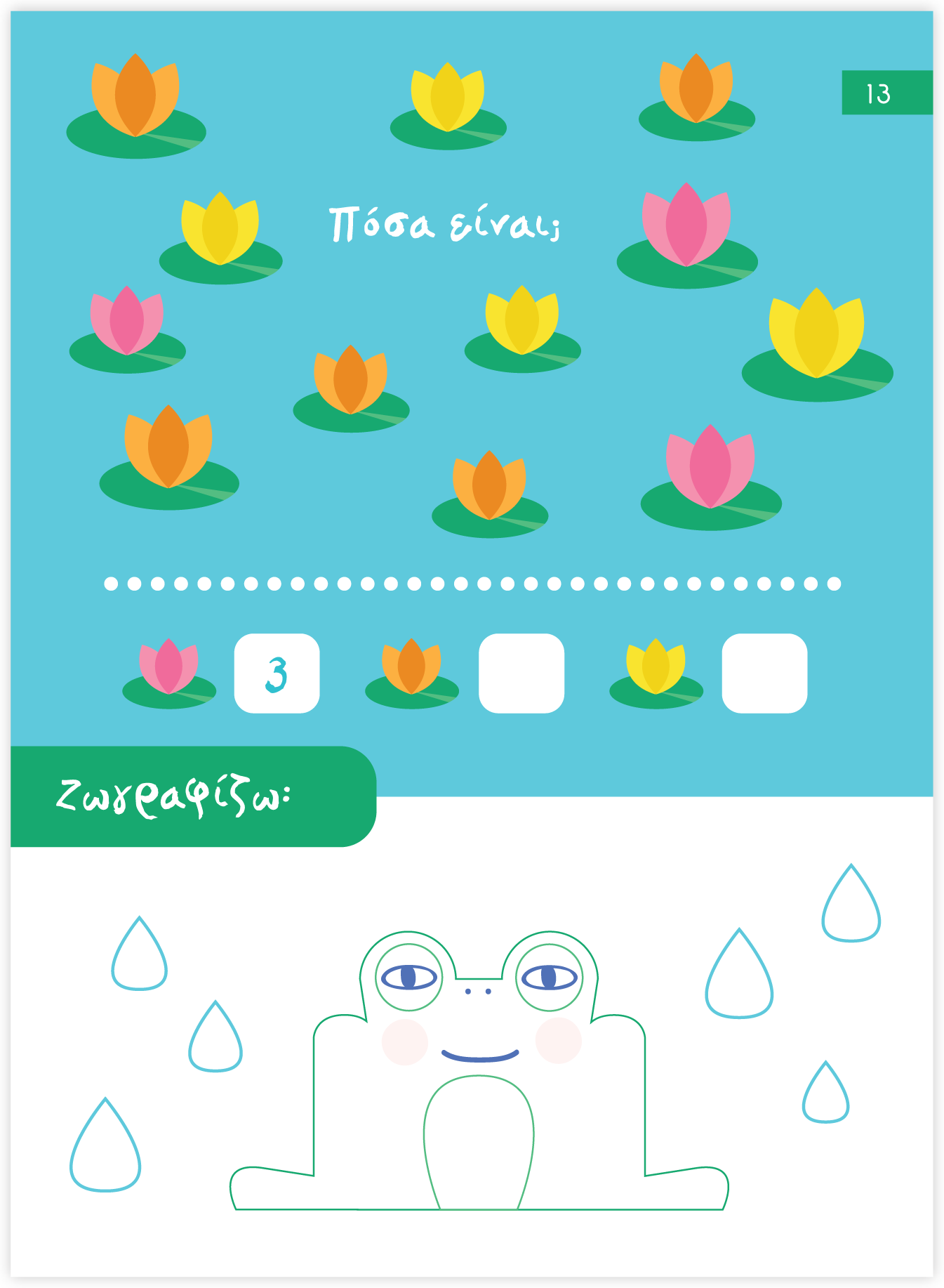 Μέσα από το βιβλίο αυτό τα παιδιά θα γνωρίσουν την γραφή και τους αριθμούς από το 1-10, θα έρθουν σε επαφή με προμαθηματικές έννοιες, θα εξοικειωθούν με μαθηματικούς συλλογισμούς, θα εξασκήσουν την παρατηρητικότητα και τη μνήμη τους.